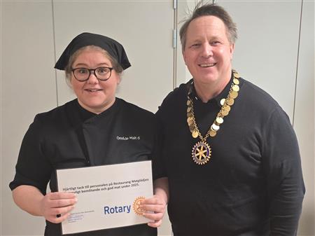 Alltsedan vi bytte lunchlokal från Stadshotellet till Restaurang Matglädje på Höglandssjukhuset har klubben serverats ypperlig mat och fått jättefin service av personalen. Vid klubbmötet den 19 december passade klubbens president Joakim Westberg på att tacka personalen för det fina bemötandet vi fått under hela 2025. Vi ser fram emot ett nytt Rotaryår tillsammans med er!